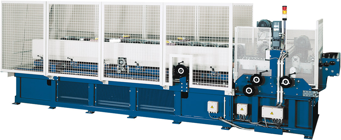 I indløbsområdet sidder en tværgående rullemaskine (rulle-skarer) med hærdede rullemesser, som kan slibes eller udskiftes let. Den korteste skærelængde er omkring 1.100 mm.