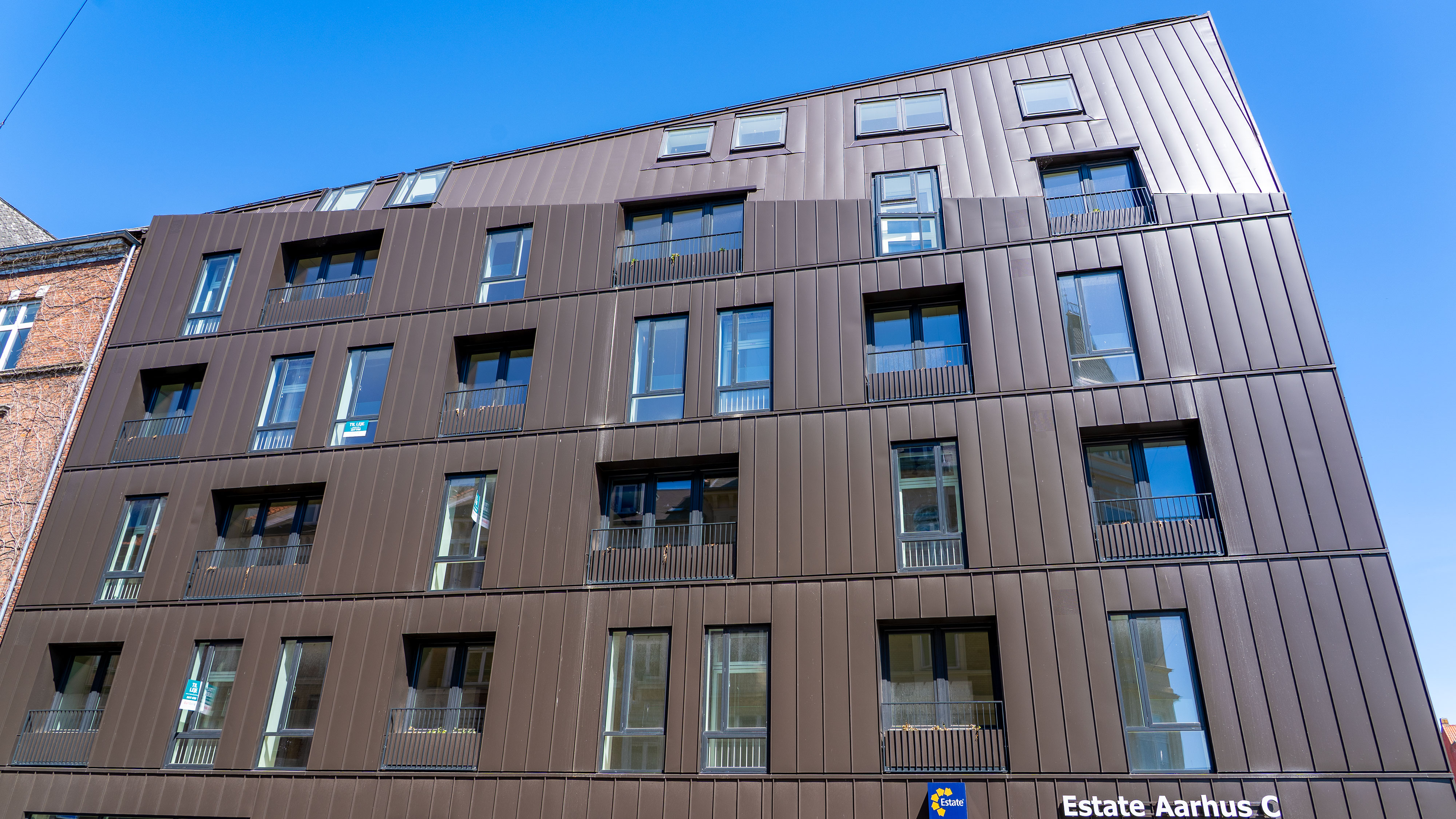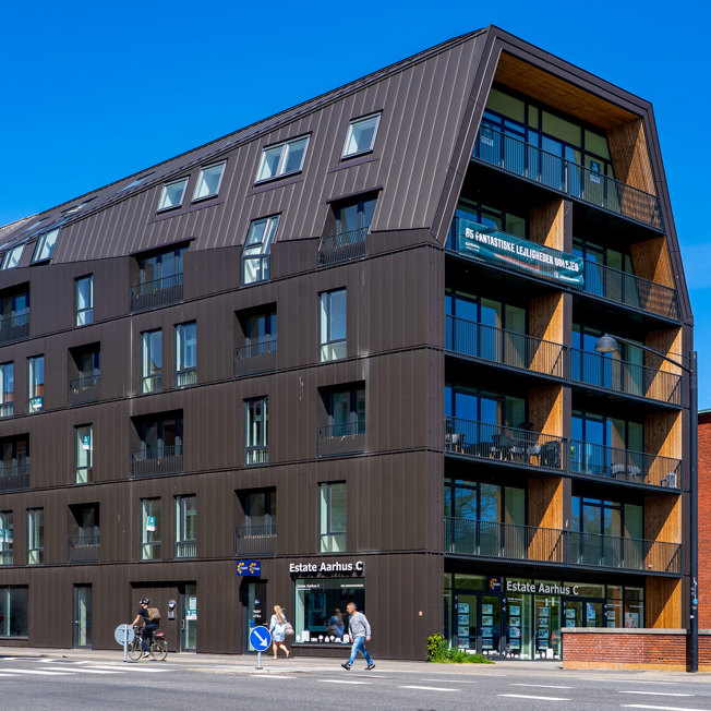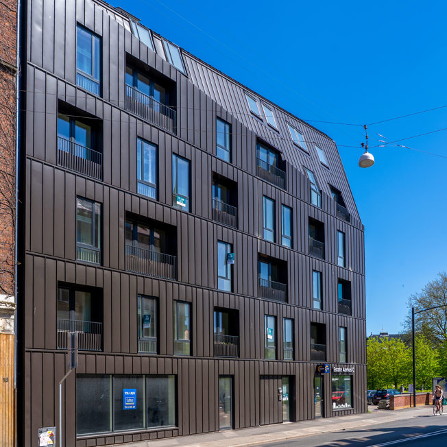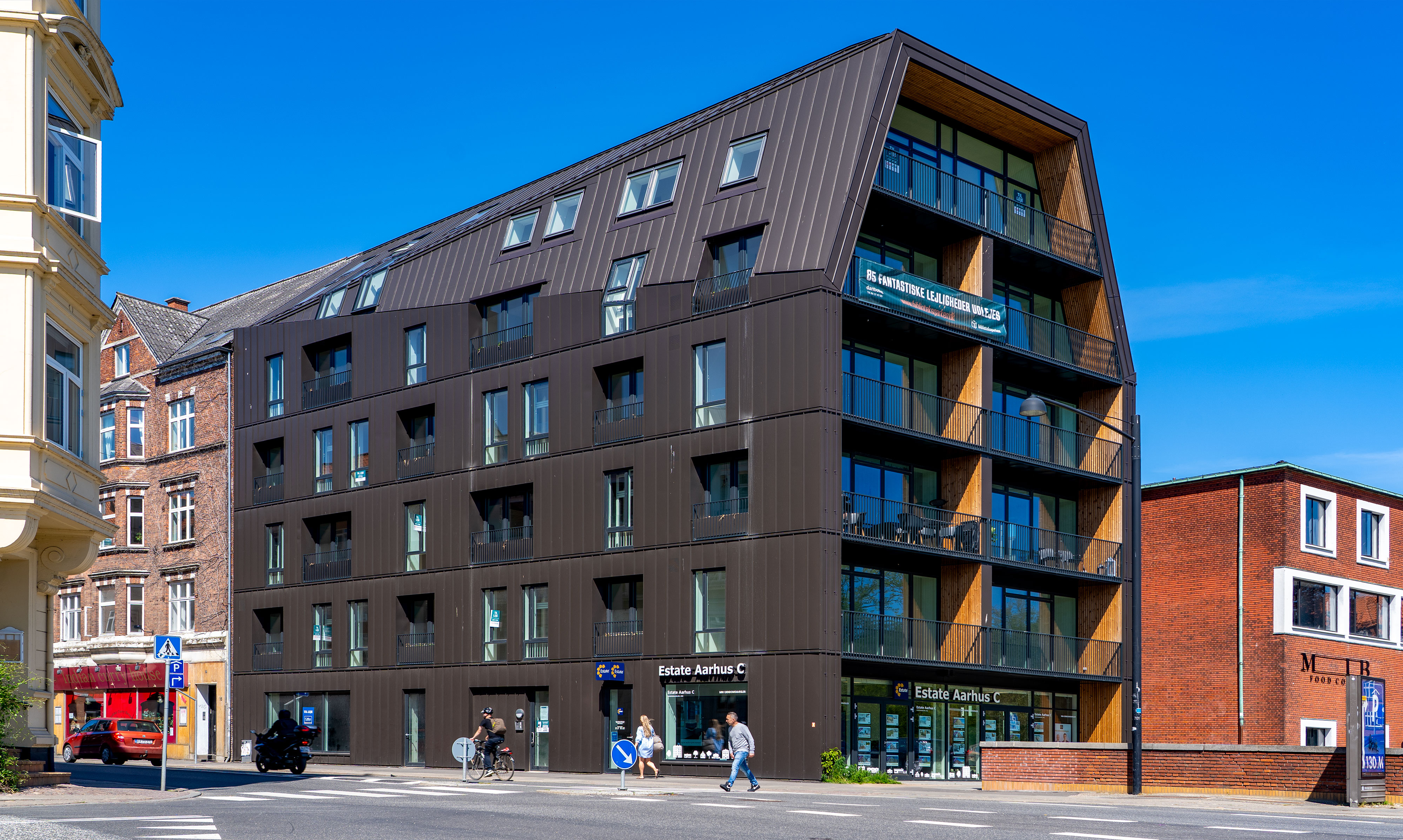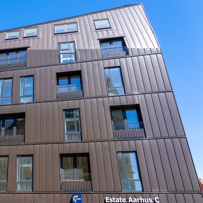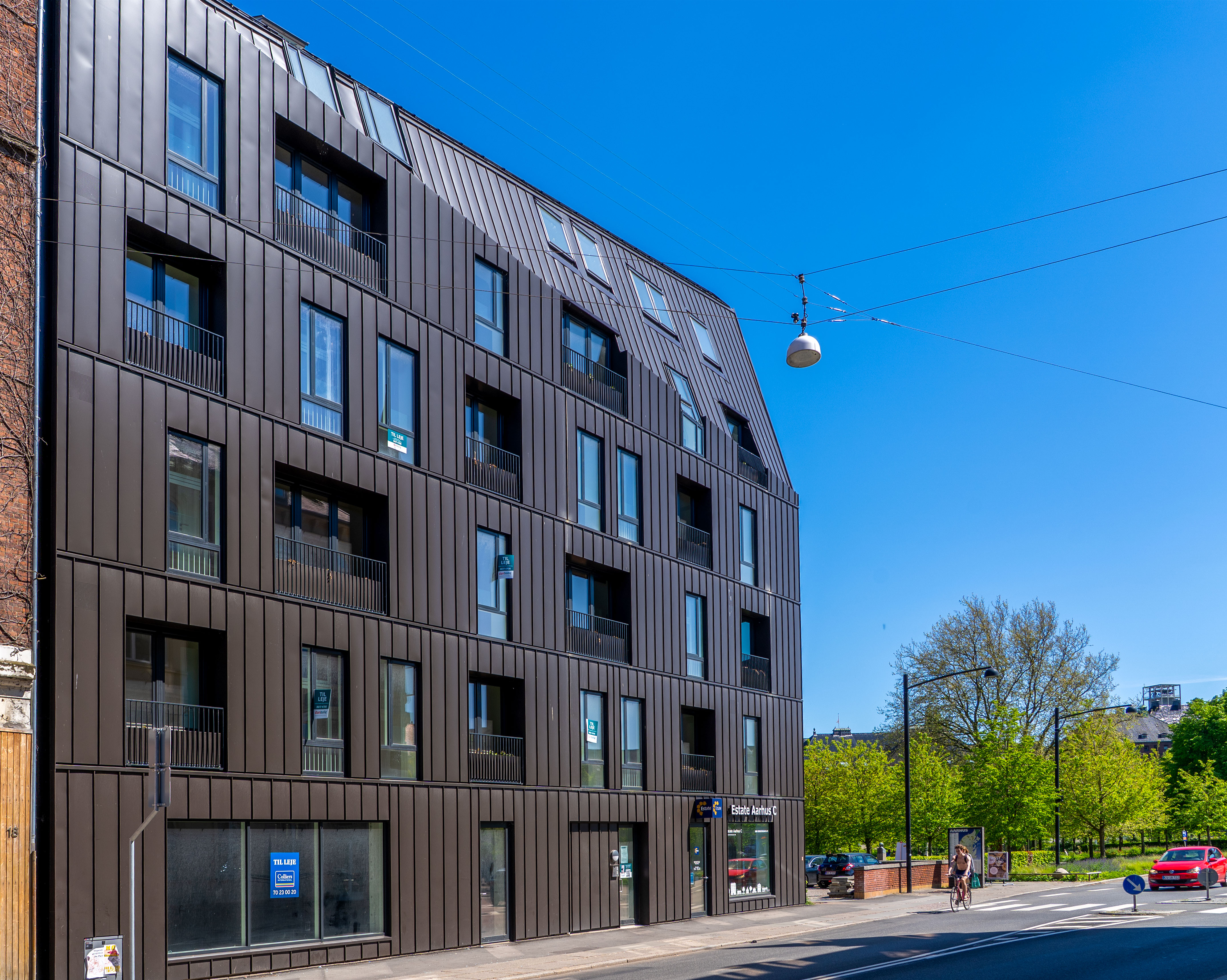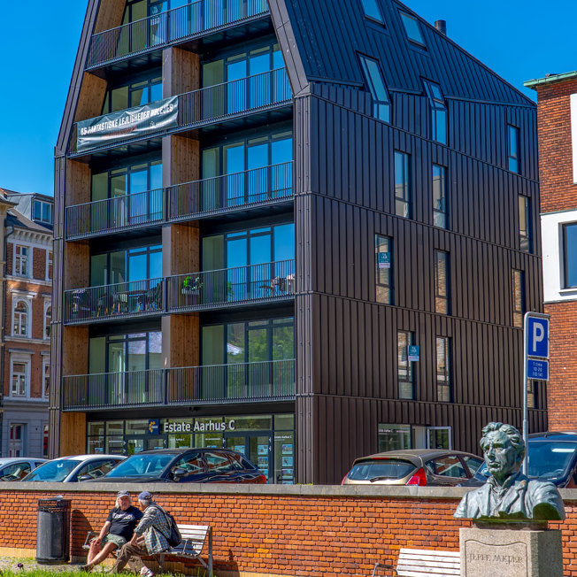 På Vester Allé i Aarhus er denne markante ejendom beklædt med falset aluminium – en løsning, der samler tag og facade i et konsekvent, moderne udtryk. De lodrette false giver bygningen en rolig rytme og en skarp geometri, som understreger volumen og de varierede facadepartier med indhak, altaner og vinduesfelter.