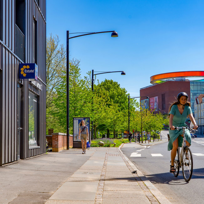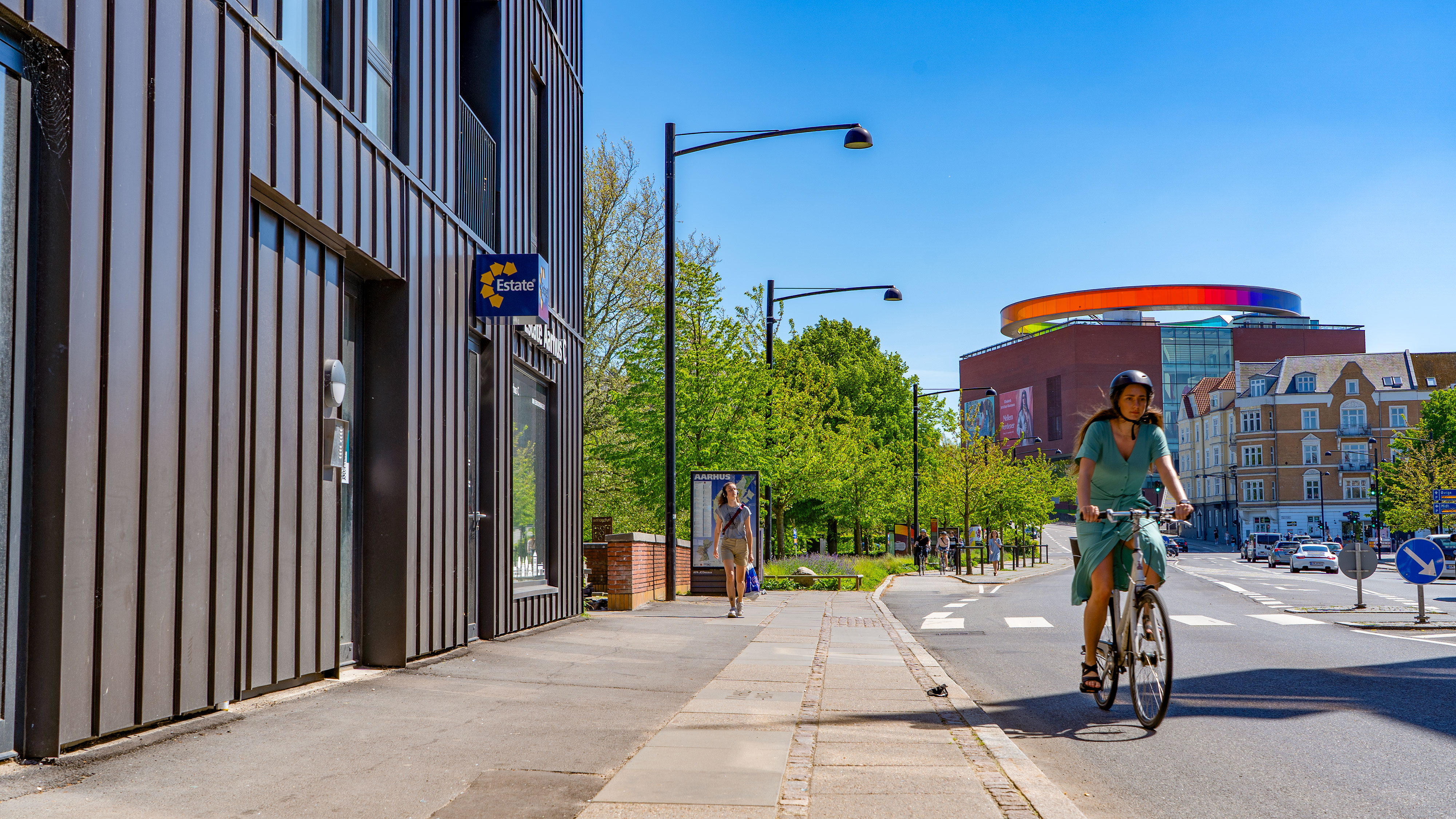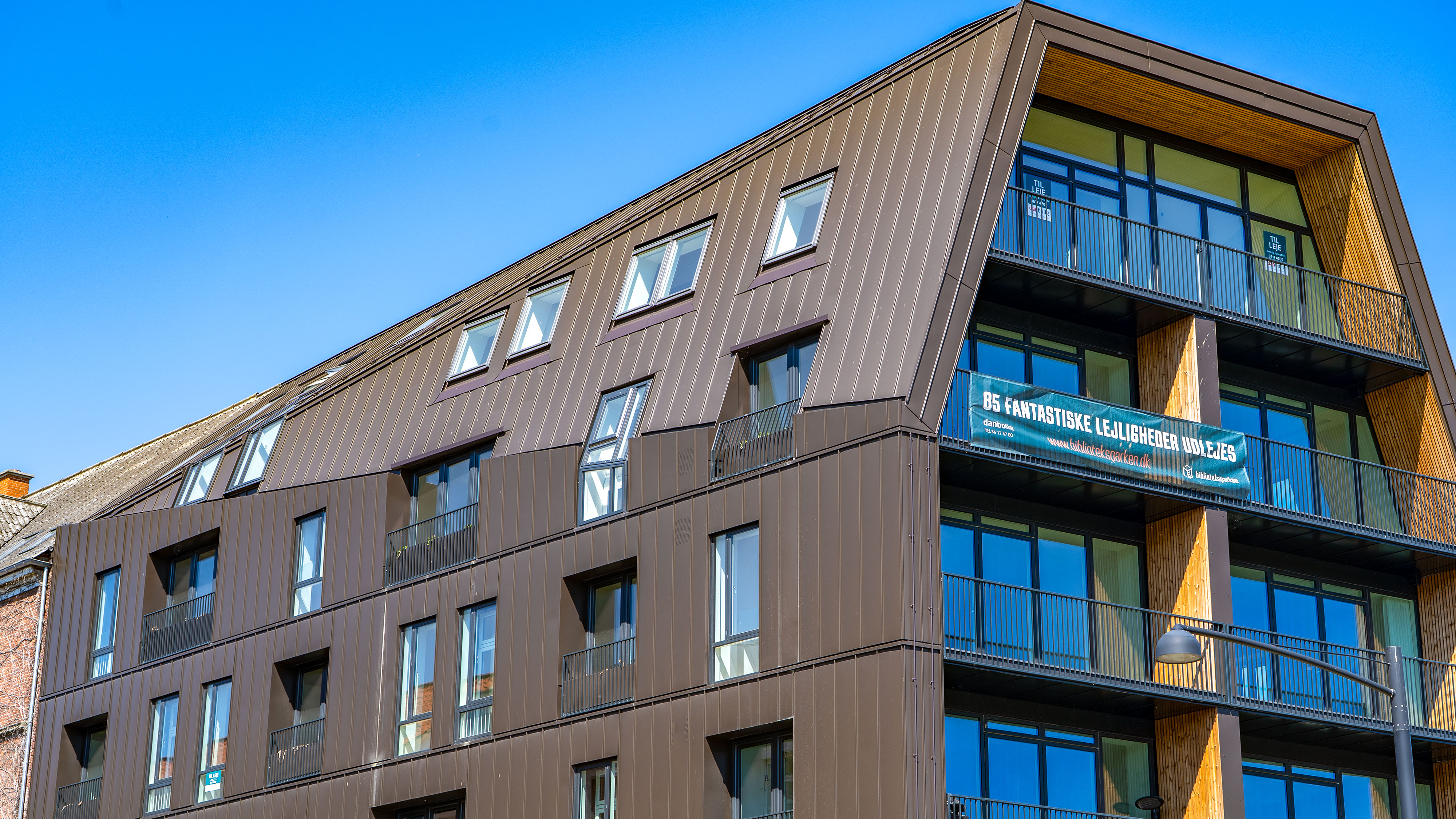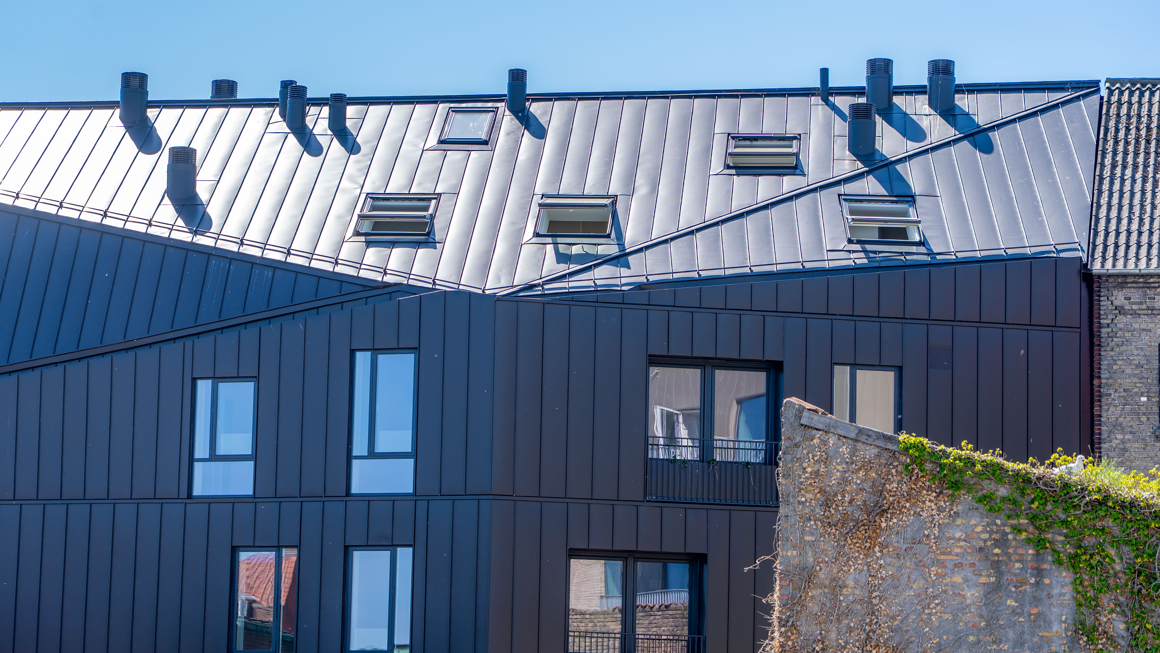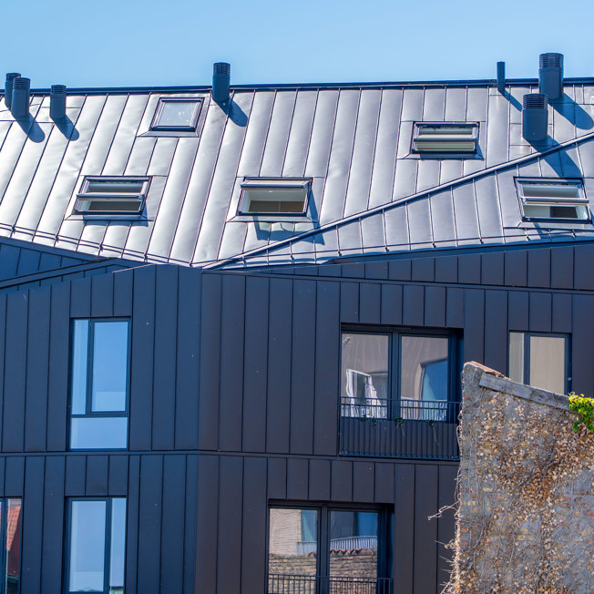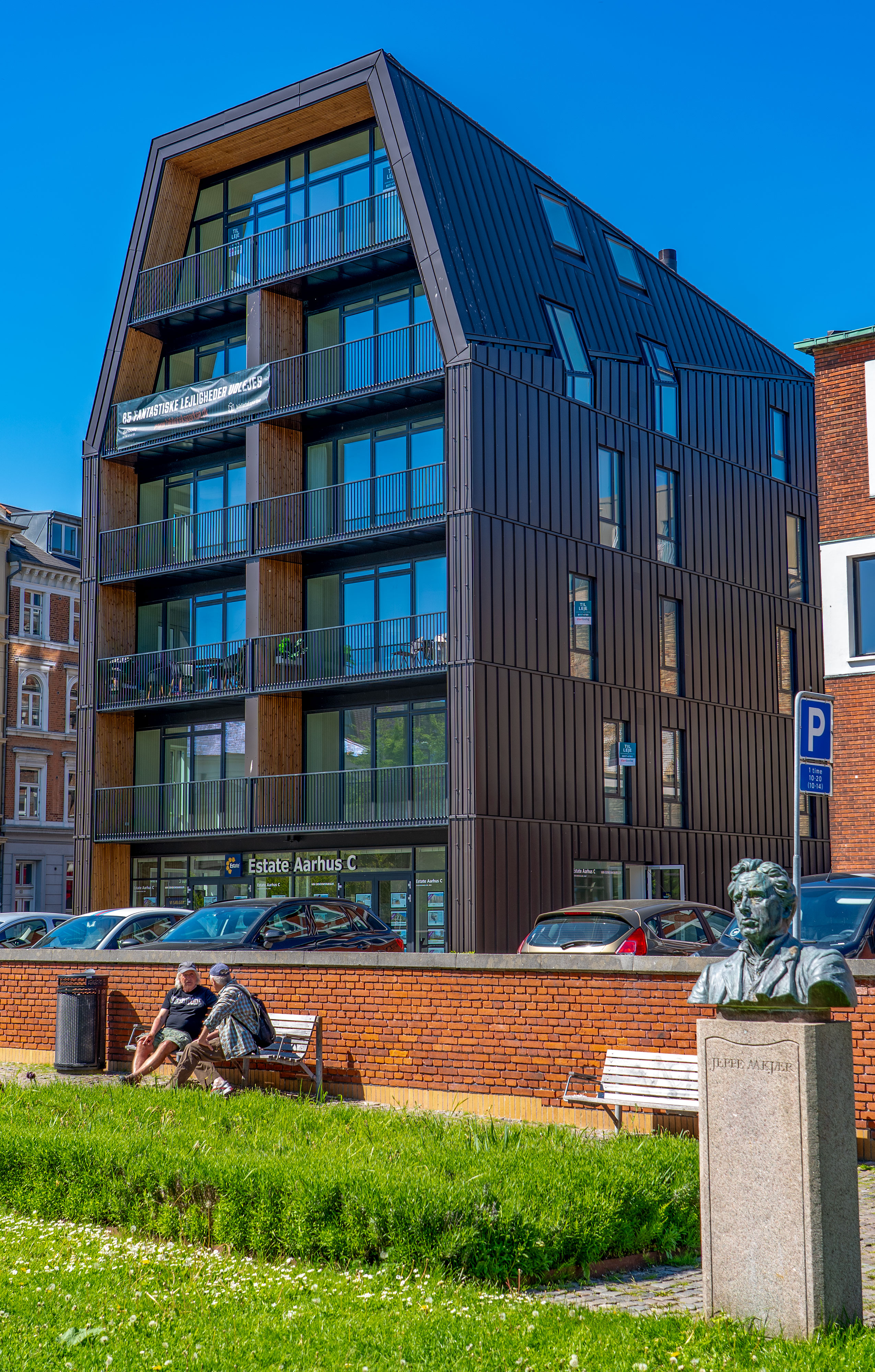 På Vester Allé i Aarhus er denne markante ejendom beklædt med falset aluminium – en løsning, der samler tag og facade i et konsekvent, moderne udtryk. De lodrette false giver bygningen en rolig rytme og en skarp geometri, som understreger volumen og de varierede facadepartier med indhak, altaner og vinduesfelter.