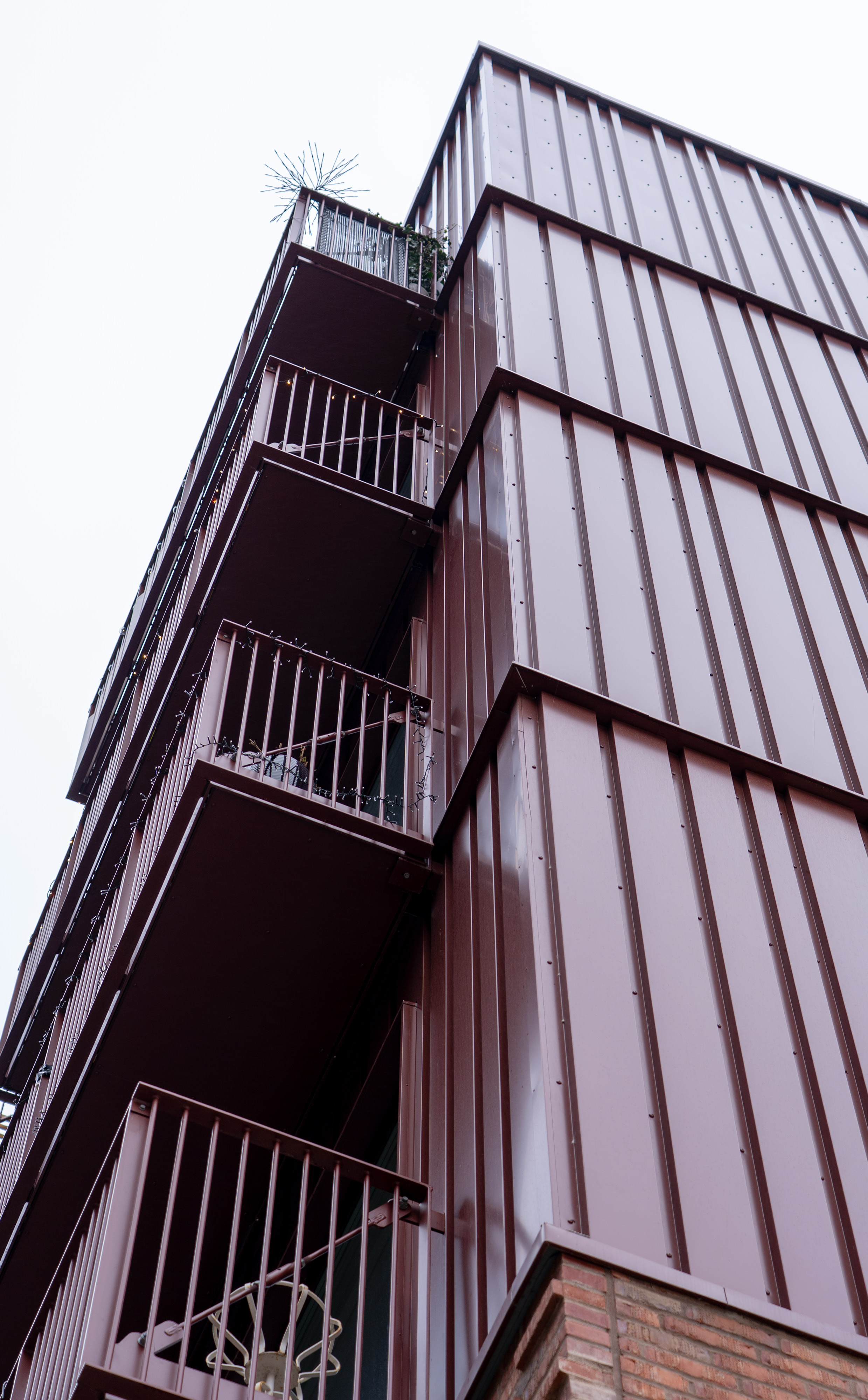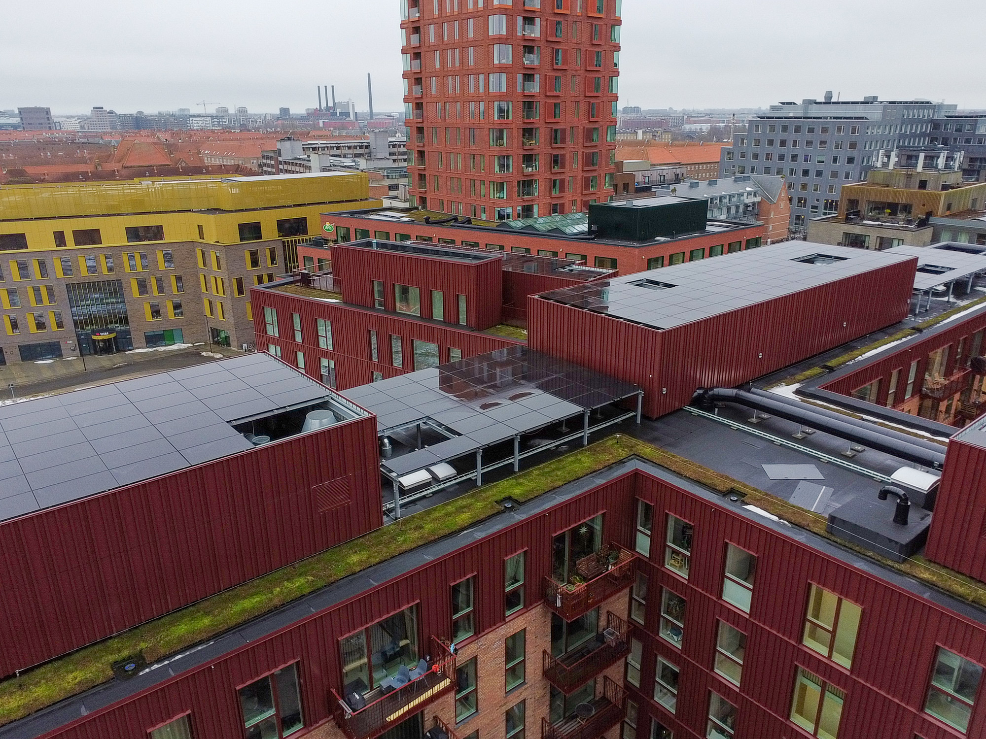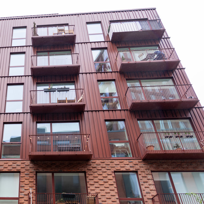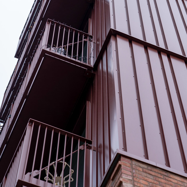 Farvesætningen er udført i brun RAL 8015, som giver facaden en varm, dyb tone, der harmonerer med områdets industrielle arv og samtidige byudvikling. Den lakerede overflade sikrer en holdbar finish med minimal vedligeholdelse og et ensartet udtryk over tid.