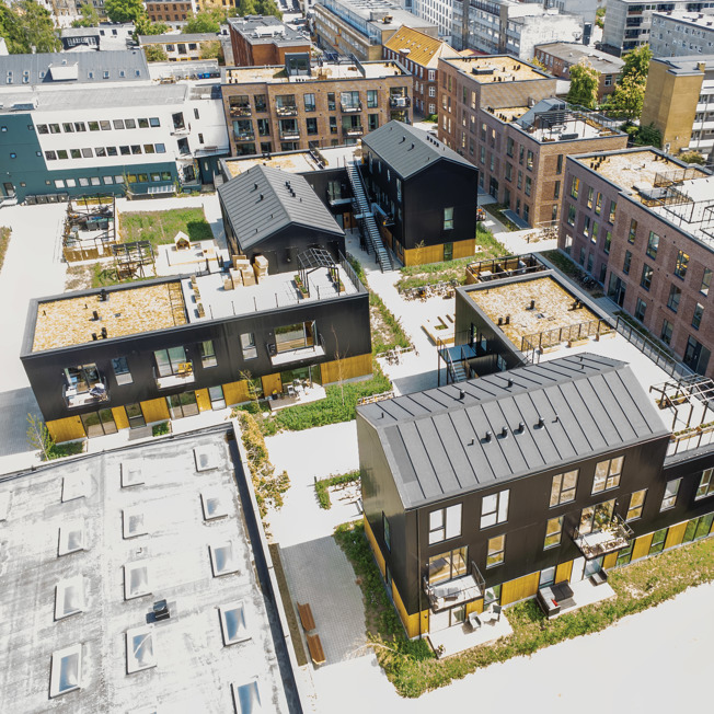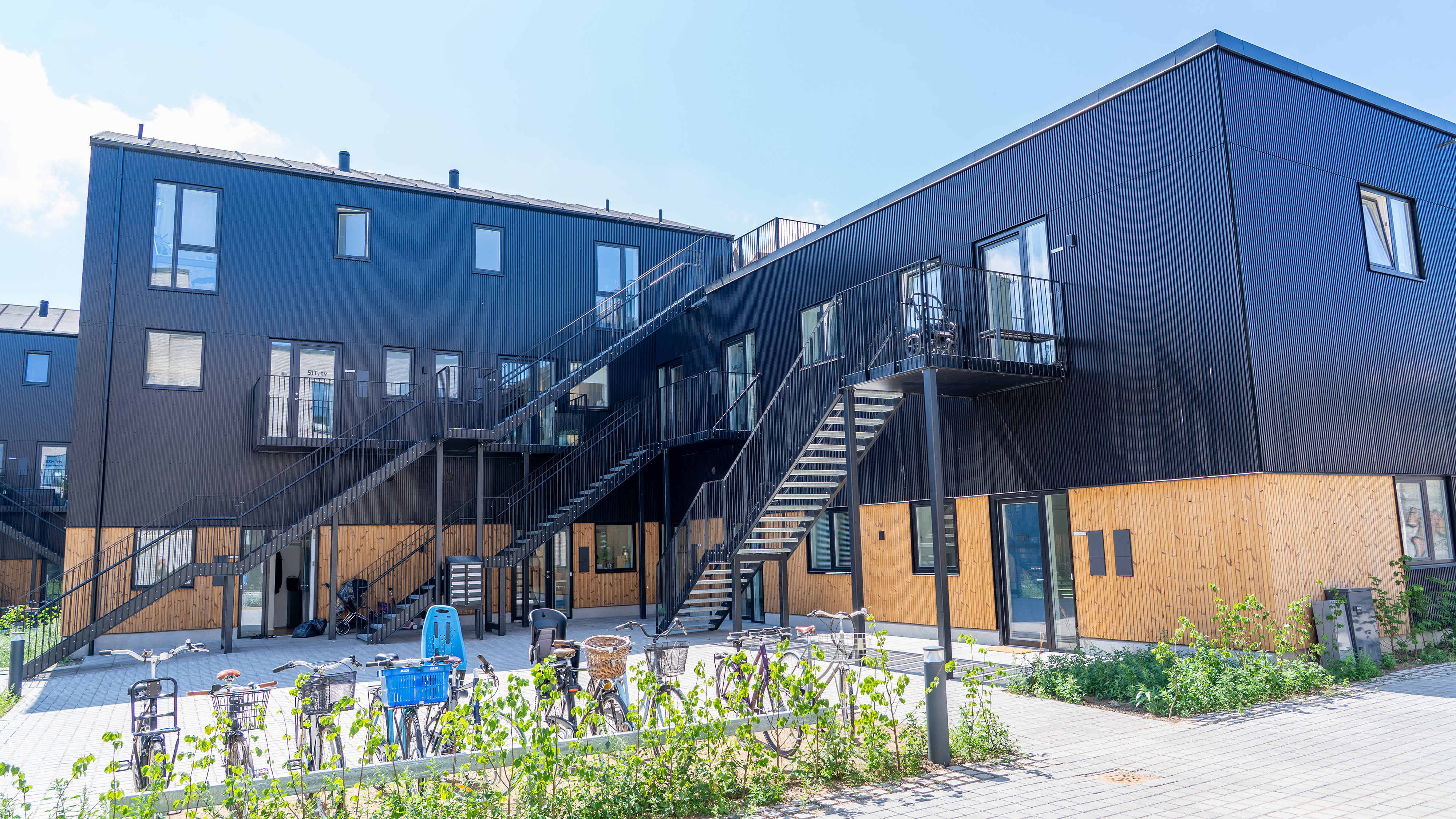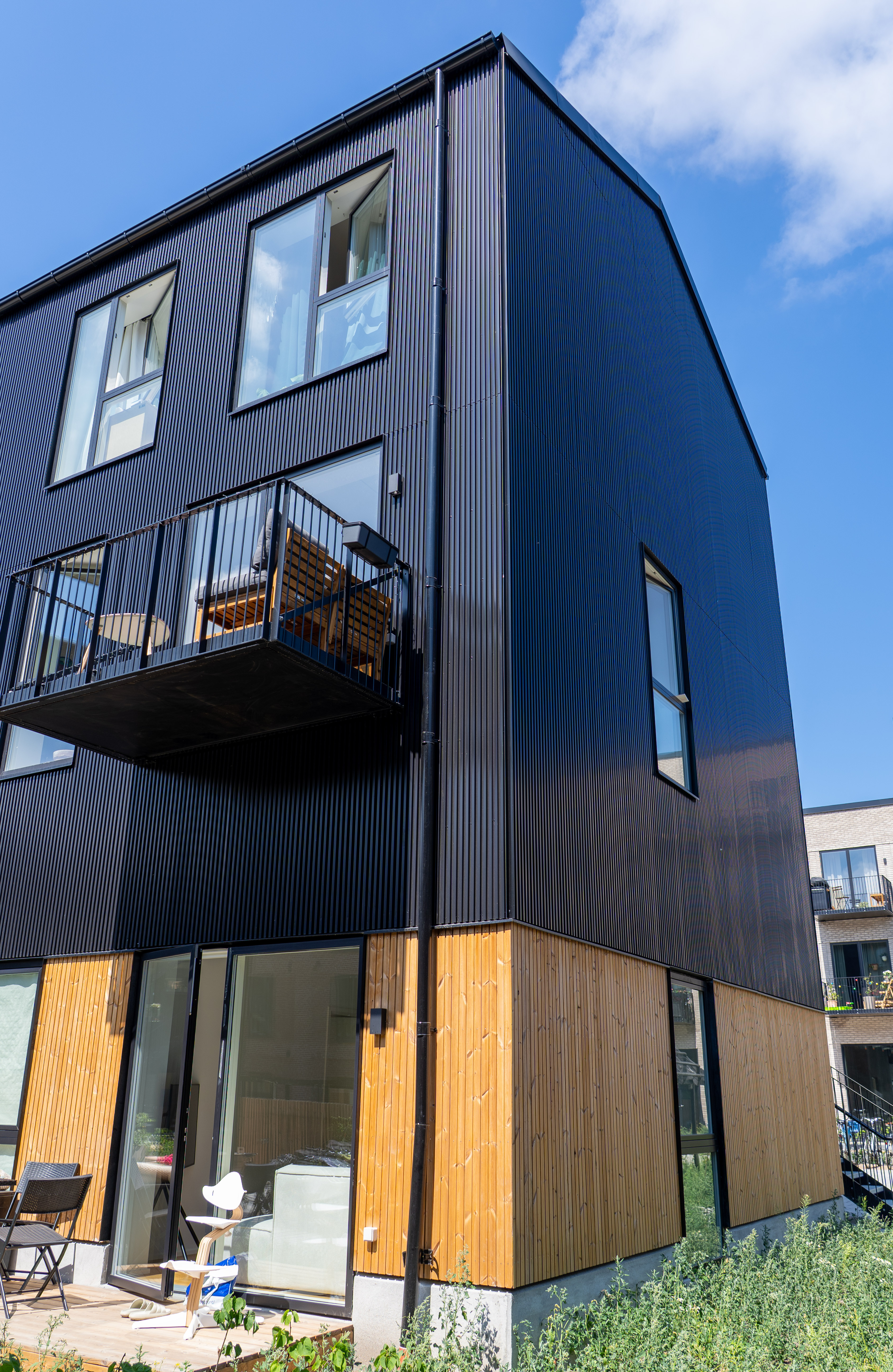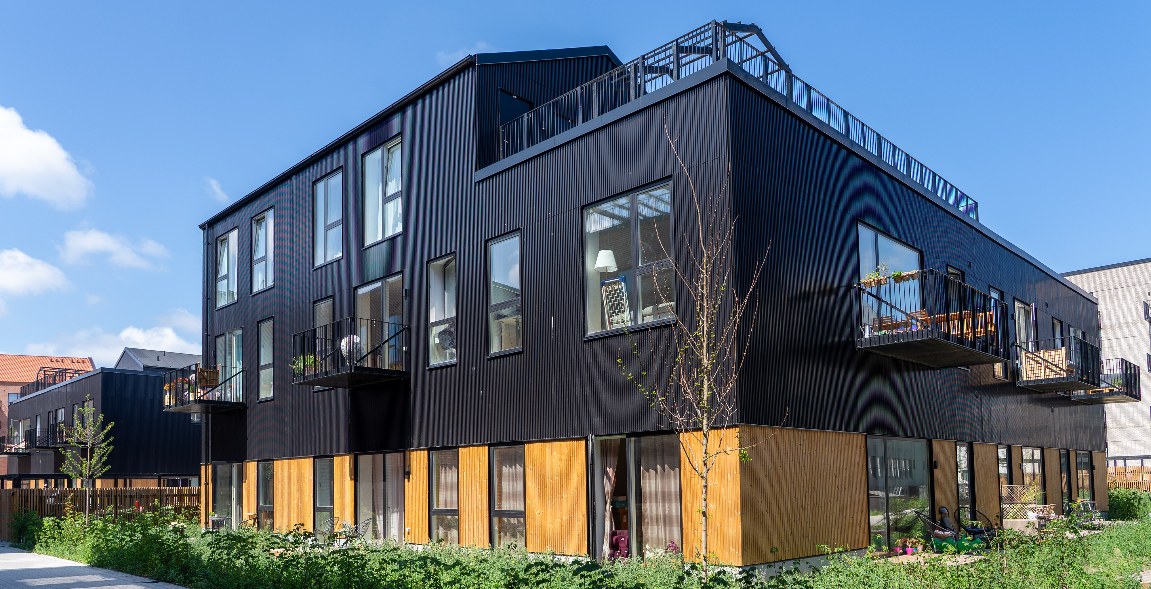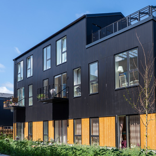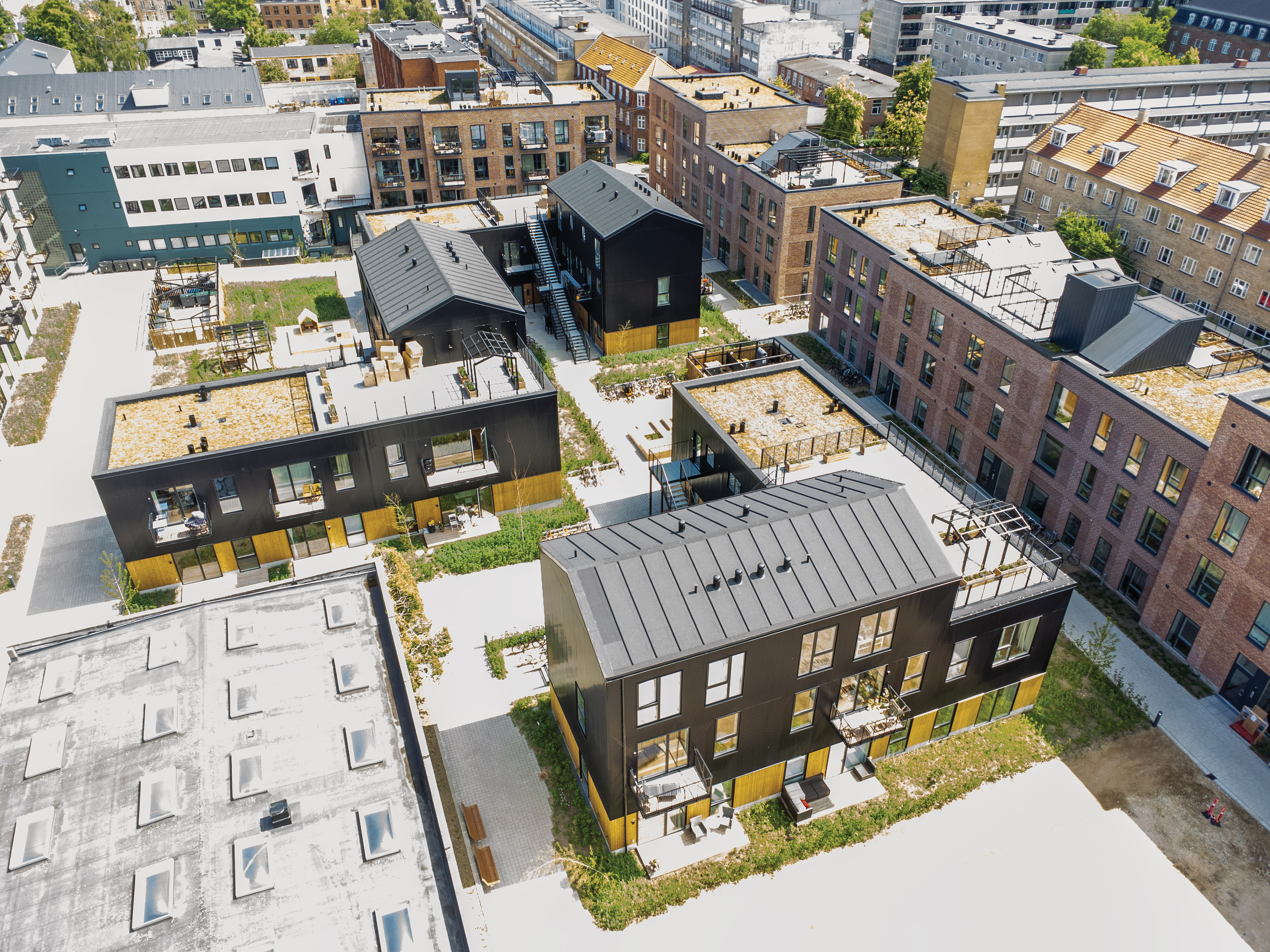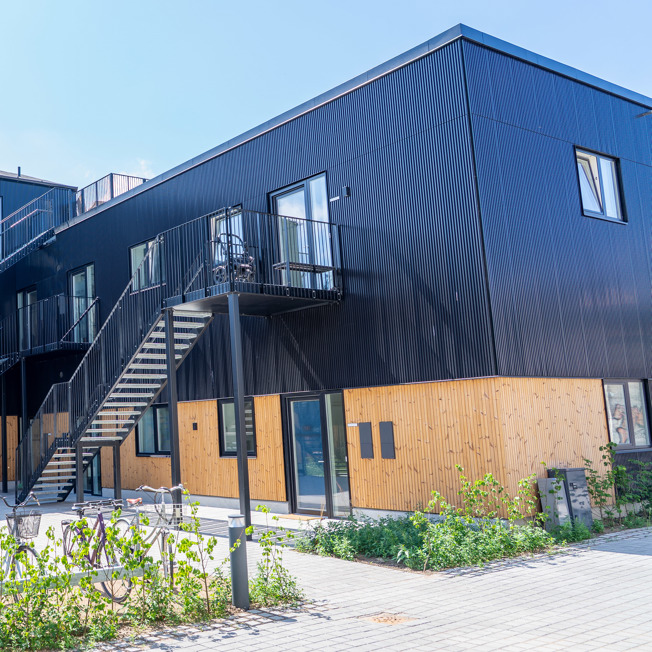 Vi har leveret FKM-profiler i aluminium, der sikrer en fleksibel og ensartet løsning på tværs af både facade og tag. Den sorte overflade i RAL 9005 understreger bygningernes enkle formsprog og skaber en flot kontrast til de omkringliggende materialer og grønne gårdrum.